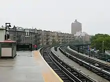 The Dyckman Street station was constructed as part of the IRT's West Side Line (now the Broadway–Seventh Avenue Line) north of Hillside Avenue. Work on this section was conducted by E. P. Roberts and Terry & Tench Construction Company, who started building the viaduct on January 19, 1903.[6] The West Side Branch of the first subway was extended northward to a temporary terminus of 221st Street and Broadway on March 12, 1906 with the first open station at Dyckman Street, as the stations at 168th Street, 181st Street, and 191st Street were not yet completed.[7][8][9] This extension was served by shuttle trains operating between 157th Street and 221st Street until May 30, 1906 when express trains began running through to 221st Street.[10] The opening of the first subway line, and particularly the Dyckman Street station, helped contribute to the development of Upper Manhattan.[3]:9
