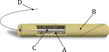Dynamite is usually sold in the form of cardboard cylinders about 20 cm (8 in) long and about 3.2 cm (1 1⁄4 in) in diameter, with a weight of about 190 grams (1⁄2 troy pound).[6] A stick of dynamite thus produced contains roughly 1 MJ (megajoule) of energy.[7] Other sizes also exist, rated by either portion (Quarter-Stick or Half-Stick) or by weight.