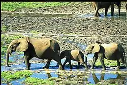 Dzanga-Sangha Forest Reserve is ecologically rich and contains a variety of megafauna such as western lowland gorillas, African forest elephants, bongo antelopes, African forest buffalos,[2] white-nosed and moustache monkeys, grey-cheeked mangabeys, bushpigs, duikers, and many different bird species.[10][11] Of particular note are the western lowland gorillas and forest elephants. Dzanga-Sangha Forest Reserve has one of the highest population densities of gorillas in the world, with an estimated 2000 of them living within the reserve's precincts.[6] Since the establishment of the reserve, it has been an important location for research into the western lowland gorillas [12] and forest elephants, in particular.[13] A number of papers have been published by naturalists working with the park, including the leading expert in the world on forest elephants Andrea Turkalo, and Mike Fay (J. M. Fay) and Marcellin Agnagna.[13] There are thousands of insect species.[7][11] Rodent species include cane rat, giant rat, and porcupine.[8] The reserve is also noted for its dark-crowned forest eagles, which have an average wingspan of 1.55 metres, and the blue-breasted kingfisher.[6]