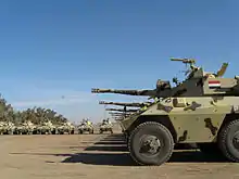 During the Iran–Iraq War, EE-9 Cascavels were operated by Iraqi garrisons near the Persian Gulf. The armoured cars were frequently able to outmanoeuvre the heavier Iranian tanks and tracked combat vehicles on the relatively flat, sandy terrain near the coastal region.[23] Coalition air strikes later destroyed several north of Kuwait City in Operation Desert Storm.[24] Following the 2003 invasion of Iraq, the surviving fleet was condemned for scrap; however, American technical personnel did restore thirty-five to working order in 2008 and present them to the New Iraqi Army.[25] Locally modified EE-9 were refurbished by Iraqi militias of the Popular Mobilization Forces, with some having their 90mm replaced or supplemented by DShk or ZPU machine guns, 107mm Type 63 rockets or a 2A28 Grom gun. They were used against Islamic State forces.[18]
