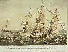 The battle of Pulo Aura was a minor naval engagement fought on 14 February 1804, in which a fleet of East Indiamen, including Earl of Abergavenny, intimidated, drove off, and chased a powerful French naval squadron, although the French squadron was much stronger than they. Commodore Nathaniel Dance's aggressive tactics persuaded Contre-Admiral Charles-Alexandre Durand Linois to retire after only a brief exchange of shot. Dance, in Warley, together with several of the other vessels, then chased the French warships until his convoy was out of danger. The British lost only one man killed.[6] Earl of Abergavenny did not actually take part in the exchange of fire.