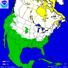 Early news reporting suggested that the severe cold would cause high mortality among the emerald ash borer based on the opinion of a US Department of Agriculture spokesperson suggesting "The progressive loss of ash trees in North America due to this insect has probably been delayed by this deep freeze."[66] This has been widely repudiated based on scientific studies of underbark temperature tolerances of emerald ash borer in Canada.[67][68][69]
