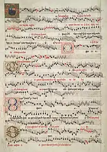 In the early Middle Ages, ecclesiastical music was dominated by monophonic plainchant.[1] The separate development of British Christianity from the direct influence of Rome until the 8th century, with its flourishing monastic culture, led to the development of a distinct form of liturgical Celtic chant.[2] Although no notations of this music survive, later sources suggest distinctive melodic patterns.[2] This was superseded, as elsewhere in Europe, from the 11th century by Gregorian chant.[3] The version of this chant linked to the liturgy as used in the Diocese of Salisbury, the Sarum Use, first recorded from the 13th century, became dominant in England. This Sarum Chant became the model for English composers until it was supplanted at the Reformation in the mid-16th century, influencing settings for masses, hymns and Magnificats.[4] Scottish music was highly influenced by continental developments, with figures like thirteenth-century musical theorist Simon Tailler who studied in Paris, before returning to Scotland where he introduced several reforms of church music.[5] Scottish collections of music like the thirteenth-century 'Wolfenbüttel 677', which is associated with St Andrews, contain mostly French compositions, but with some distinctive local styles.[5] The first notations of Welsh music that survive are from the 14th century, including matins, lauds and vespers for St David's Day.[6]