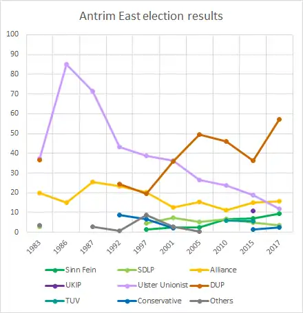 The main interest in Westminster Elections has been the contest between the Ulster Unionist Party and the Democratic Unionist Party. In 1983 the UUP were only 367 votes ahead of the DUP. As part of a pact to oppose the Anglo-Irish Agreement the DUP did not contest the seat until 1992 but they still failed to come close, though in the 1996 elections to the Northern Ireland Forum they were only slightly behind the UUP. But in the 2001 general election they achieved an astonishing result when they came with 128 votes of winning the Westminster seat, despite not having targeted it. In the 2003 Assembly election they followed this up by gaining two additional MLAs and outpolling the UUP for the first time.