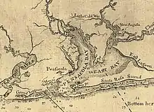 The east side of East Bay is pinched into a wide river-like shape, called East Lagoon, until eventually becoming an actual river at East Bay River. The Lagoon starts where the bay is met by Axelson Point and Miller Point.[2][3][4]