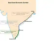 The East Coast Economic Corridor (ECEC) is India’s first coastal economic corridor covering 2500km of India's coastline, to be developed with the help of the Asian Development Bank (ADB). The ADB is to invest $500 million in infrastructural development of the project. [1] Since late 2013, ADB has been supporting studies on transport corridors in India. Phase 1 of the ECEC is Visakhapatnam-Chennai Industrial Corridor (VCIC) which had been approved by the ADB board in October 2016. The ECEC running along the entire east coast of India from Kolkata to Kanyakumari, is a multimodal, regional maritime corridor that can play a vital role in unifying the large domestic market, as well as integrating the Indian economy with the dynamic global value chains of Southeast and East Asia. [2] It would play a crucial role in the Government of India’s (GoI) Make in India campaign and also supports the port-led industrialization strategy under the Sagar Mala initiative and the Act East Policy by linking domestic companies with the vibrant global production networks of East and Southeast Asia. [3]