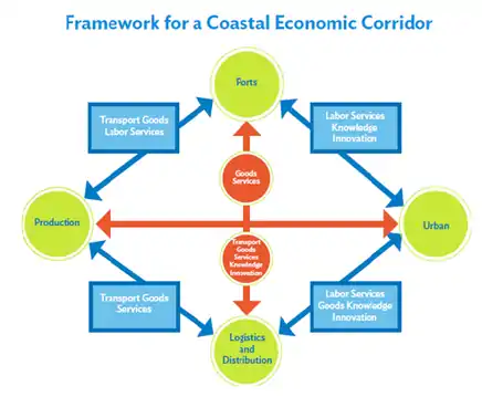 Economic corridor development (ECD) is an approach that integrates and synergizes industry, infrastructure, logistics, and urbanization through industrial production clusters linked to urban centers and international gateways by an efficient multimodal transport network. A successful ECD strategy requires quality infrastructure and a policy framework that contributes to an efficient industrial base, attracts investment in the manufacturing sector, and facilitates production for domestic and export markets. Urban centers within a corridor are not only major markets for manufactured and imported goods, but also sources of labor, technology, knowledge, and innovation.[4]