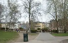 The placement of the Royal Palace, on which construction started in 1824, was to be significant for the development of the East End and the West End. The castle architect Linstow drew a connection between the city and the palace in a city plan from 1838, so that there would be apartments for the well off along the connecting streets Karl Johans gate, Kristian IV:s gate and St. Olavs gate. In contrast, an area that became called Bak Slottet (Behind the Royal Palace), along Parkveien and Wergelandsveien, did become popular by the elite, having had city villas constructed in the 1840s to secure a pleasing neighbourhood for the new royal residence in Slottsparken. Homansbyen for the upper class bourgeois dates from the late 1850s.[5] In the 1860s and especially in the 1870s, a ring of new, socially similar residence areas were built around the old town: Hegdehaugen, Uranienborg, along Drammensveien, Meyerløkka in the west, Fredensborg, Youngsløkka, the lower end of Grünerløkka and Nedre Tøyen in the east. Rented apartments were originally a form of living for the upper class - the first one in the city arrived in the 1840s and was located near Grev Wedels plass, along Karl Johans gate, and Maltheby in Akersgata 65,[6] whereas the worker class lived in wooden houses in the suburbs.