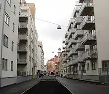 The buildings were first and foremost rented apartment buildings in these districts, built one block at a time under the supervision of a building contractor, and are today called "murbyen".[12] The district structure was similar both in the East End and the West End, and the facades of the houses were made of stuccoed brickwork and the decorations were mostly similar. Gråbeingårdene in Tøyen without decorations and with visible tiles was a prominent exception and was criticised for poor-looking formation in order to house apartments - at that time, it was factory buildings, churches, fire stations and hospitals that had tile facades.