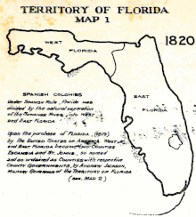 Under Spanish rule, Florida was divided by the natural separation of the Suwanee River into West Florida and East Florida. Upon the purchase of Florida, (1819) by the United States of America, West Florida and East Florida became two counties: Escambia County and St Johns County, so named and so ordained as counties with respective county governments by Andrew Jackson, Military Governor of the Territory of Florida.