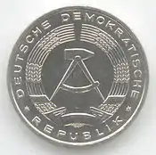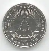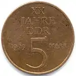 There were 123 commemorative coins altogether, with face values of 5, 10 or 20 Mark. The coins were released for various anniversaries or special events. Silver, copper/nickel/ zinc (German silver / nickel silver) or other alloys were used for the coins. A complete list of all released commemorative coins can be found in the "Liste der Gedenkmünzen der DDR".[5] Some of the commemorative coins were produced in very large volumes, especially the one shown above. These coins entered circulation, because they had little or no additional value for collectors due to the large numbers issued.