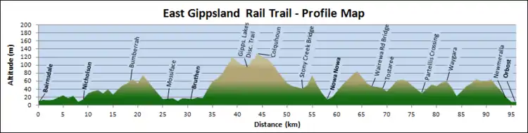 The East Gippsland Rail Trail travels from just east of the current Bairnsdale railway station along the old Orbost railway line easement, past or through the small towns of Nicholson, Bruthen, Nowa Nowa, and Newmerella, with a short connecting path taking it into Orbost. Water and most facilities are only available in these towns, so trail users are required to be self-sufficient. The trail follows the long gradual inclines and sweeping curves of the former railway line, reaching a maximum altitude of 129m at Colquhoun.[2]