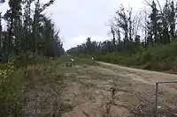 Another 3 km on is the first crossing of Joiners Rd, and from this point to Newmerella - about 5 km distance - the trail travels very closely to the Princes Highway[2] with increasing signs of development such as timber mill operations and a pumping station for the underground gas pipeline. The trail crosses Prestons Road, which provides access to the small town of Newmerella, while the trail itself continues for another couple of kilometres, doglegging through a cutting around a steep hillside, then providing views over the Snowy River floodplain before descending to the end of the trail at Burn Rd, north of the Princes Highway at Newmerella.[7]