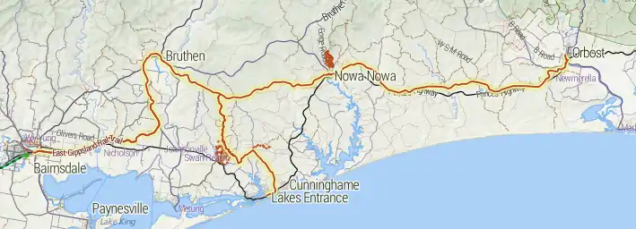 The trail continues to the small town of Nowa Nowa where it diverts through the town, departing from the former railway route.[2] It runs onto an old section of the highway and down to the Lakes Entrance Road, where it then turns sharply onto a concrete path through the town. The path takes an underpass below the highway and leaves town after crossing a bridge over Boggy Creek, finally rejoining the original railway route beyond the east side of the town.[6]