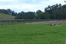 The track leaves Nowa Nowa after crossing the bridge over Boggy Creek and soon rejoins the railway line formation. The former Nowa Nowa railway station is just north of the realigned rail trail, with the station site itself now used as an emergency helicopter landing place.[5] Not far from town the track descends to a creek level crossing over Ironstone Creek, bypassing the first and smallest of three wooden trestle bridges in this section.[7] Following this the track steadily climbs over several kilometres on a rough loose gravel surface through a gradually drier environment largely composed of banksia and eucalypt vegetation, and areas of open farmland, then descends towards Wairewa Road[7] about 9 km from Nowa Nowa.[8] The original rail line crossed this spot on a spectacular curved timber trestle bridge, the largest of the three on this part of the route. While the bridge remains, the trail again bypasses it due to the costs that would be involved in making and keeping the bridge safe, descending down and across Wairewa Road, then climbing back up to the level of the railway.[7]