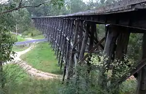 The East Gippsland Rail Trail itself continues east through the Colquhoun State Forest on a generally good surface at a gradual decline. A few kilometres on from the Discovery Trail turnoff is the site of the former Colquhoun railway station and siding, which, at 129m is the highest point on the trail, however the site is rapidly being overgrown by forest.[2][5] Further along, about 4.5 km west of Nowa Nowa is the spectacular Stony Creek Trestle Bridge, built in the early 1900s and measuring 276m long and 19m high. Due to its poor condition the bridge itself is fenced off, and trail users must travel down and up the steep slopes of the Stony Creek valley to reach the far side. A car park, toilet and picnic facilities are available at this location.[5]