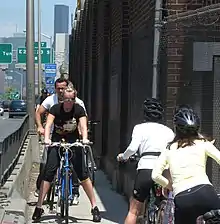 Some places are narrow due to sinkholes being blocked off by protective fencing, and one part squeezes between the highway and the dock of Con Edison's East River Station, requiring slower speeds. Other parts are shared space with motor access to Waterside Plaza or a filling station. Approximately one mile (1.6 km) near the southeast end is in the shadow of the elevated FDR Drive. This part is to be improved by the East River Esplanade project. In February 2019, NYC Parks allocated $75 million to complete the esplanade within East Harlem, East Midtown, and the Lower East Side.[1][2]
