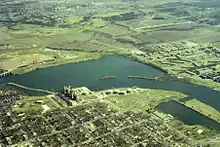 Until the mid-20th century, the East Riverside-Oltorf area remained largely rural and many vast plots of land were still deeded to the Del Valle land grant. In 1949, the Austin Country Club opened on land purchased from the Del Valle grant.[6] Golfer Harvey Penick, a teacher at the Country Club, built a small cluster of homes facing the golf course along Penick Place.[7] The land between Pleasant Valley Road and the Country Club was formerly a cattle farm owned by Fagan Dickson and Roberta Crenshaw. In 1973, the Dicksons applied to redevelop their 497 acres into a sprawling planned unit development divided into 25 sections, known as "The Crossing". The development included an extension of Lakeshore Boulevard from Pleasant Valley Road along the river to Montopolis Drive.[8] The development that came to fruition was a handful of parcels bounded by Crossing Place and Faro Drive; Crenshaw later donated 30 acres to establish Roy G. Guerrero Park and sold the remaining land to developers to construct student housing.