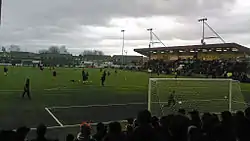 At the start of the 21st century the club struggled financially, paying players £10-a-week and manager Dennis Newall became the first unpaid manager at senior level in Scottish football.[38] As a result, the club ranked last in the Scottish Football League for five consecutive seasons from 2002–03 to 2006–07, losing 24 consecutive league games in the 2003–04 season, recording only 8 points from two wins and two draws in 36 games.[39][40][41] From the 2005–06 season, it was determined if a club finished bottom of the Third Division twice in successive years, it would face the risk of being reduced to associate member status, meaning the loss of voting rights.[42] In East Stirlingshire's case, a league vote was held and concluded in favour of the club retaining full member status with the condition that it did not finish last the following season in 2008.[43] The club won its final game of the season to move off the bottom of the table in a 3–1 win against Montrose, which was also the last game at Firs Park.[44] The following season, retaining full member status, the club moved to Ochilview Park in a ground-share agreement with neighbours Stenhousemuir.