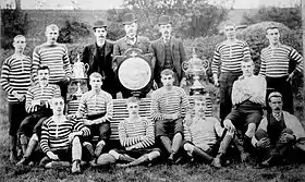East Stirlingshire's official date of formation was in 1881,[6] but its origins can be traced to the previous year when a local cricket club called Bainsford Bluebonnets formed a football team under the name Britannia.[7] The team's first recorded match was a friendly against Falkirk's second eleven in December 1880 and resulted in a 7–0 defeat while its first match as East Stirlingshire was against the same opponent in August 1881.[8] The club's nickname is "The Shire", which refers to the Stirlingshire part of the club name.[6] After joining the Scottish Football Association, the club became eligible to compete in the Scottish Cup, Scotland's main association football knock-out competition, eliminated in its first game in 1882. In December 1883, the Stirlingshire Football Association was founded, with membership open to clubs exclusively from the county of Stirlingshire. It resulted in the establishment of a new regional tournament called the Stirlingshire Cup, with the club reaching the final in its first season.[9] East Stirlingshire dominated the tournament in its early years, winning it for a record four years in a row between 1885 and 1889,[9] including an emphatic 9–0 victory against Falkirk in the 1888 final.[10] Two goals came from Lawrence McLachlan who was an influential goalscorer in the club's early successes; scoring more times than any other East Stirlingshire player with 135 known goals.[7]