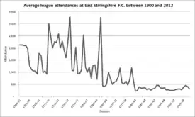 Between 1891 and 1899, the club competed in regional leagues, including winning the Midland Football League[12] and Central Football Combination,[13] before being elected to the second tier of Scotland's main national league competition – the Scottish Football League – in 1900–01, ending its first season ranked 7th from ten.[14][15] In March 1905, a proposal was raised for the club to merge with neighbours Falkirk with an aim to creating a bigger and more financially stable club, which Falkirk accepted in a vote. However, East Stirlingshire's vote was not in favour and the club rejected the proposal.[16] The years following included finishing bottom of the league in 1905–06, recording only one win from 22 games, contrasting with finishing as high as third in table in 1912–13, narrowly missing out on winning the championship by two points.[15][17] The club remained in Division Two until 1914–15 when it, and the Scottish Cup, were both suspended due to World War I.[18]