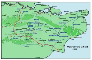The River East Stour is one of the tributaries of the Great Stour in Kent.[1] The East Stour, 10.3 miles (16.5 km) long,[2]) rises on the Greensand ridge at Postling north of Hythe as a number of small streams. It then flows under the M20 motorway to continue in a westward direction: the river meanders across the Low Weald plain, passing Mersham on the way. The East Stour's confluence with the Great Stour is on both sides of Pledge's Mill at the foot of East Hill, Ashford.
