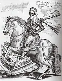 Charles I attempted to bolster the Trained Bands as a national force under royal control. In the Bishops' Wars the East and North Yorkshire Trained Bands were expected to join the King's Army, with deficiencies in their arms made up from the arsenal at Hull, but there was great reluctance throughout the militia to serve outside their own counties, even for pay.[13] Control of the militia was one of the areas of dispute between King Charles I and Parliament that led to the First English Civil War. On 12 February 1641 Parliament appointed the Earl of Essex as a fit person to be entrusted with organising the Trained Bands of Hull and the East Riding.[14] When Charles approached Hull in April 1642, Parliament's governor, Sir John Hotham, called out 800 men of the Trained Bands (illegally, since the position of Lord Lieutenant was vacant) and prevented the king from seizing the arsenal. In response, Charles called out the remainder of the East Riding's men as a regiment under Sir Robert Strickland to join his investing army. In the event, both sides took the Trained Bands' weapons and gave them to paid volunteers who would serve anywhere in the kingdom in permanent regiments.[15][16]