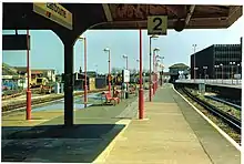 With the increase in services serving Eastbourne, now a popular resort, under LB&SCR Chief Engineer Frederick Banister a station was resited a little to the east in 1872 and rebuilt in 1886 and designed by F.D. Brick, in 1886.[2] which a vaulted canopy and lantern roof, similar to Lewes. The station had 4 platforms which increased in length over the years. There was also two run around loops between platforms 2 and 3. Over the years one of the runaround loops was lost as platforms 1 and 2 was built wider. On 12 April 1977 platform 4 was shortened from a 12 coach to an 8 coach length to make way for the ring road construction.[4] It was then taken out of use and the track lifted during the Eastbourne re-signalling in 1991