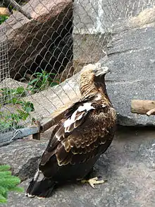 The eastern imperial eagle is quite a large eagle but usually falls near the middle of sizes in the large-bodied genus Aquila. Adult total length can range from 68 to 90 cm (27 to 35 in) with a typical wingspan of 1.76 to 2.2 m (5 ft 9 in to 7 ft 3 in).[2][15][16] The average wingspan of a small sample showed males to average 1.95 m (6 ft 5 in) while a small sample of females averaged 2.07 m (6 ft 9 in).[17] Although otherwise outwardly similar, the species displays reverse sexual dimorphism as do most birds of prey, in which males are usually smaller than the females. For the eastern imperial eagle, females are up to 10% larger linearly and 40% heavier in body mass in some cases.[2][18] In terms of body mass, one survey found five males to weigh from 2.45 to 2.72 kg (5.4 to 6.0 lb) and five females to weigh from 3.26 to 4.54 kg (7.2 to 10.0 lb). The average weight of this sample of imperial eagles was reportedly 2.62 kg (5.8 lb) in the males and 3.9 kg (8.6 lb) in the females.[2][19][20] A sample of unknown size showed males to weigh an average 2.88 kg (6.3 lb) while females reportedly weighed an average of 3.38 kg (7.5 lb).[21][22] A further two mature females weighed an average of 3.56 kg (7.8 lb).[17] Among standard measurements, males may range in wing chord length from 540 to 622 mm (21.3 to 24.5 in), in tail length from 260 to 308 mm (10.2 to 12.1 in) and in tarsus length from 91 to 98 mm (3.6 to 3.9 in). Meanwhile, females may range in wing chord length from 565 to 665 mm (22.2 to 26.2 in), in tail length from 270 to 330 mm (11 to 13 in) and in tarsus length from 97 to 107 mm (3.8 to 4.2 in).[2][9]