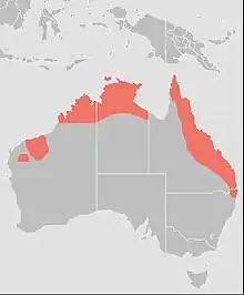 In Australia, the range extends into subtropical regions, and it has been recorded from a few widely scattered localities in New Guinea.[1][4]