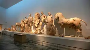 The Eastern pediment of the Temple of Zeus at Olympia depicts the tale of Pelops just before the chariot race[1] wherein he kills the king Oenomaus in order to win the hand of his daughter Hippodamia.[2] The depiction of this chariot race on the east pediment of the Temple of Zeus at Olympia, along with that of the Twelve Labours of Heracles on the metopes of the frieze, relate to the location of the temple in Olympia; the chariot race and Heracles were both believed to have started the tradition of the Olympic Games.[3]