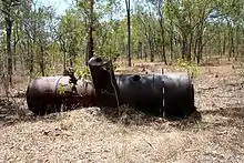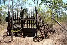 On western side of the station track and to the south of the survey peg, are indications of former building and habitation sites. Timber stumps, corrugated iron sheeting and piles of roughly cut timber are concentrated in places here and in other areas within the main township area. These remnants are found in close association with exotic trees, usually mangoes. Other notable features within the township area are a number of bottle and rubbish dumpsites, the remains of an old dray or wagon and cattle yard fencing.[1]