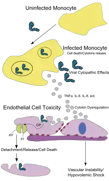 Endothelial cells may be infected within three days after exposure to the virus.[49] The breakdown of endothelial cells leading to blood vessel injury can be attributed to EBOV glycoproteins. This damage occurs due to the synthesis of Ebola virus glycoprotein (GP), which reduces the availability of specific integrins responsible for cell adhesion to the intercellular structure and causes liver damage, leading to improper clotting. The widespread bleeding that occurs in affected people causes swelling and shock due to loss of blood volume.[94] The dysfunctional bleeding and clotting commonly seen in EVD has been attributed to increased activation of the extrinsic pathway of the coagulation cascade due to excessive tissue factor production by macrophages and monocytes.[23]