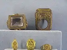 Cardinal bishops and cardinal priests are conferred a ring by the pope himself in the consistory, in which the new cardinal is named to a particular titular church (for a cardinal priest) or suburbicarian diocese (for a cardinal bishop) and elevated to the cardinalate. The pope determines the style of this ring. In the past, a cardinal's ring could be set with a sapphire, while it bore on the inner side of the bezel the arms of the pope conferring it. The solid gold cardinal's ring chosen by John Paul II bears an oblong crucifixion scene.[11] Pope Benedict XVI used the same at first, but chose a new design from the consistory of 2012.[12]