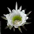 Echinopsis pachanoi is native to Ecuador and Peru. Its stems are light to dark green, sometimes glaucous, with a diameter of 6–15 cm (2.4–5.9 in) and usually 6–8 ribs. The whitish areoles may produce up to seven yellow to brown spines, each up to 2 cm (0.8 in) long although typically shorter in cultivated varieties, sometimes being mostly spineless.[2] The areoles are spaced evenly along the ribs, approximately 2 cm (0.8 in) apart.[3] Echinopsis pachanoi is normally 3–6 m (10–20 ft) tall and has multiple branches, usually extending from the base but will emerge around broken branches.[2] The tallest recorded specimen was 12.2 metres (40 ft) tall.[3] White flowers are produced at the end of the stems; they open at night and last for about two days. Large numbers can be produced by well established cacti and may open new flowers over a period of weeks. The flowers are large, around 19–24 cm (7.5–9.4 in) long with a diameter of up to 20 cm (7.9 in) and are highly fragrant. There are black hairs along the length of the thick base leading to the flower. Oblong dark green fruits are produced after fertilization, about 3 cm (1.2 in) across and 5–6 cm (2.0–2.4 in) long.[2]