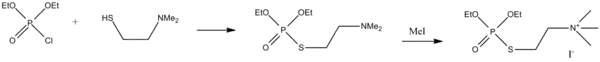 Echothiophate is made by reacting diethylchlorophosphoric acid with 2-dimethylaminoethylmercaptan, giving S-(2-dimethylaminoethyl)-O,O-diethylthiophosphate, which is alkylated by methyl iodide, forming echothiophate.[3]