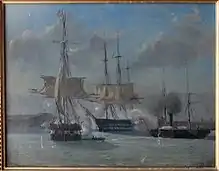 During the Battle of Eckernförde in 1849, the Danish Ship of the line Christian VIII and the Danish frigate Gefion were shot at by beach batteries from Schleswig-Holstein troops. Christian VIII eventually exploded and the crewv of the frigate surrendered and the ship was taken over by the Schleswig-Holstein army.[6]