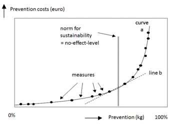 Marginal prevention costs of toxic emissions are derived from the so-called prevention curve as depicted in Figure 2. The basic idea behind such a curve is that a country (or a group of countries, such as the European Union), must take prevention measures to reduce toxic emissions (more than one measure is required to reach the target). From the point of view of the economy, the cheapest measures (in terms of euro/kg) are taken first. At a certain point at the curve, the reduction of the emissions is sufficient to bring the concentration of the pollution below the so-called no-effect-level. The no-effect-level of CO