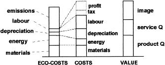 For a product which has a good present value/costs ratio, but high eco-costs, the product and the production process have to be redesigned to lower the eco-costs. This road towards sustainability is often far more promising than the strategy of enhancing the value/costs ratio of a green design.