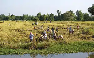 The economy of Cambodia currently follows an open market system (market economy) and has seen rapid economic progress in the last decade.[15] Cambodia had a GDP of $24.57 billion in 2018.[16] Per capita income, although rapidly increasing, is low compared with most neighboring countries. Cambodia's two largest industries are textiles and tourism, while agricultural activities remain the main source of income for many Cambodians living in rural areas.[17] The service sector is heavily concentrated on trading activities and catering-related services. Recently, Cambodia has reported that oil and natural gas reserves have been found off-shore.[18]