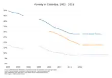 After a large crisis in 1999, poverty in Colombia has had a decreasing trend. The share of Colombians below the income-based poverty line fell from 50% in 2002 to 28% in 2016. The share of Colombians below the extreme income-based poverty line fell from 18% to 9% in the same period. Multidimensional poverty fell from 30% to 18% between 2010 and 2016.[33] [54]