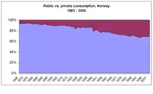 The Norwegian state maintains large ownership positions in key industrial sectors concentrated in natural resources and strategic industries such as the strategic petroleum sector (Equinor), hydroelectric energy production (Statkraft), aluminum production (Norsk Hydro), the largest Norwegian bank (DNB) and telecommunication provider (Telenor). The government controls around 35% of the total value of publicly listed companies on the Oslo stock exchange, with five of its largest seven listed firms partially owned by the state.[28] When non-listed companies are included the state has an even higher share in ownership (mainly from direct oil license ownership). Norway's state-owned enterprises comprise 9.6% of all non-agricultural employment, a number that rises to almost 13% when companies with minority state ownership stakes are included, the highest among OECD countries.[29] Both listed and non-listed firms with state ownership stakes are market-driven and operate in a highly liberalized market economy. The combination of relatively high degrees of state ownership in the Norwegian open-market economy has been described as a form of state capitalism.[30]