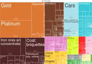 Export goods | gold, diamonds, wines, iron ore, platinum, nonferrous metals, electronics, machinery and manufactured equipment, motor vehicles, fruits, various agricultural foodstuffs, ground and air military hardware. |