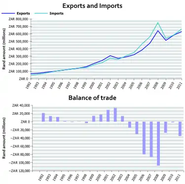 South Africa, unlike other emerging markets, has struggled through the late 2000s recession, and the recovery has been largely led by private and public consumption growth, while export volumes and private investment have yet to fully recover.[36] The long-term potential growth rate of South Africa under the current policy environment has been estimated at 3.5%.[37] Per capita GDP growth has proved mediocre, though improving, growing by 1.6% a year from 1994 to 2009, and by 2.2% over the 2000–09 decade,[38] compared to world growth of 3.1% over the same period.
