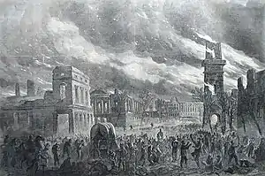 South Carolina's economy was devastated following the Civil War. Just like the other states in the Confederacy, South Carolina was plagued with financial problems ranging from an inability to sell cotton to Britain, depreciated currency, and food shortages (famously resulting in a bread riot in Columbia).[110] The state's infrastructure and cities were in ruins, Sherman's army torched Columbia, and Charleston sustained bombardment from Morris Island for 587 days.[111] Most importantly, the enslaved laborers which the state's planters had invested heavily in, were freed.
