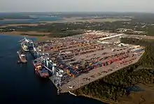 Described as a "small but busy regional operation" in the 1980s, the Port of Charleston has grown alongside the booming population in the Southeast. Between 1976 and 1986, the ports in Charleston and Savannah grew 20% while every other American port along the Atlantic Ocean declined.[155] Due to the Port of Charleston's rapid growth and the advent of Panamax ships, the port is currently undergoing a series of projects to increase the its capacity, including the construction of a new terminal at a cost of $1 billion and an intermodal facility on the old navy yard. At full build-out, the terminal is expected to double the port's capacity.[156][157] The University of South Carolina Darla Moore School of Business estimated that the SCPA's annual economic impact in the state was close to $63.4 billion in 2018.[158]