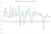 After the World Wars, a new Labour government fully nationalised the Bank of England, civil aviation, telephone networks, railways, gas, electricity, and the coal, iron and steel industries, affecting 2.3 million workers.[66] Post-war, the United Kingdom enjoyed a long period without a major recession; there was a rapid growth in prosperity in the 1950s and 1960s, with unemployment staying low and not exceeding 3.5% until the early 1970s.[67] The annual rate of growth between 1960 and 1973 averaged 2.9%, although this figure was far behind other European countries such as France, West Germany and Italy.[68]
