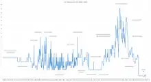 In the 20-year period from 1986/87 to 2006/07 government spending in the UK averaged around 40% of GDP.[127] In July 2007, the UK had government debt at 35.5% of GDP.[128] As a result of the 2007–2010 financial crisis and the late-2000s global recession, government spending increased to a historically high level of 48% of GDP in 2009–10, partly as a result of the cost of a series of bank bailouts.[127][128] In terms of net government debt as a percentage of GDP, at the end of June 2014 public sector net debt excluding financial sector interventions was £1304.6 billion, equivalent to 77.3% of GDP.[129] For the financial year of 2013–2014 public sector net borrowing was £93.7 billion.[129] This was £13.0 billion higher than in the financial year of 2012–2013.