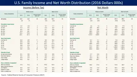 The U.S. economy experienced a serious economic downturn during the Great Recession, defined as lasting from December 2007 to June 2009. However, real GDP regained its pre-crisis (late 2007) peak by 2011,[71] household net worth by Q2 2012,[72] non-farm payroll jobs by May 2014,[73] and the unemployment rate by September 2015.[74] Each of these variables continued into post-recession record territory following those dates, with the U.S. recovery becoming the second-longest on record by April 2018.[75] In the first two quarters of 2020,[76] the U.S. economy entered recession due to the COVID-19 pandemic. This coronavirus recession has been widely described as the most severe global economic downturn since the Great Depression, and "far worse" than the Great Recession.[77][78][79][80] Income inequality ranked 41st highest among 156 countries in 2017,[81] and the highest compared to other Western nations.[82]