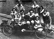 Between 1910 and 1913, he formed a family vaudeville act, "Eddie Foy and The Seven Little Foys", which quickly became a national sensation. While Foy was a stern disciplinarian backstage, he portrayed an indulgent father onstage, and the Foys toured successfully for over a decade, appearing in one motion picture.[4] His wife Madeline died in 1918. The children began to go their separate ways after Foy married Marie Reilly Coombs in 1923,[4] but four of the younger children (Charley, Mary, Madeline and Irving) performed together until the mid 1930s.[9] Foy continued to appear in vaudeville and starred in the hit Broadway comedy The Fallen Star in 1927. He died of a heart attack while headlining on the Orpheum circuit in Kansas City, Missouri, at age 71.[4]